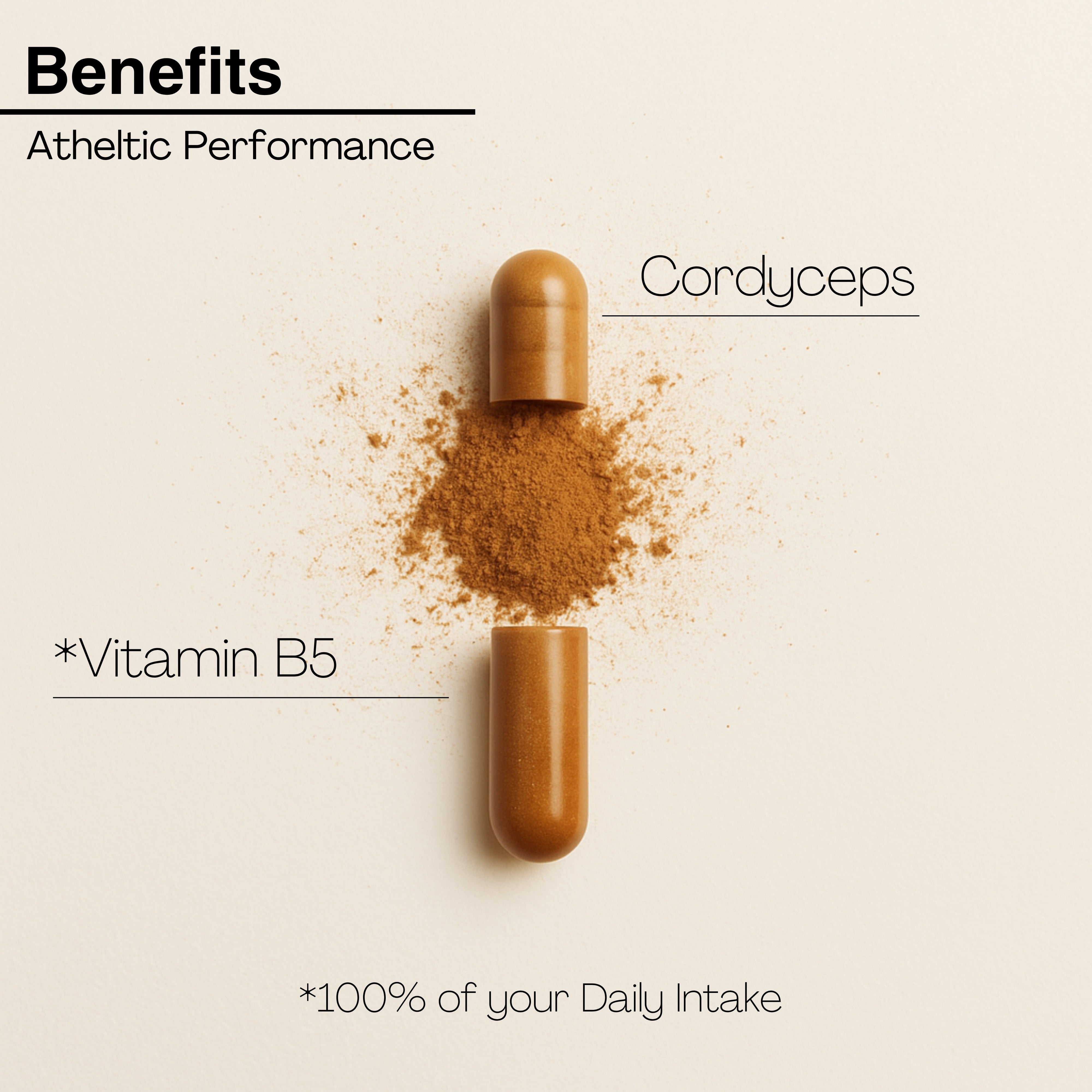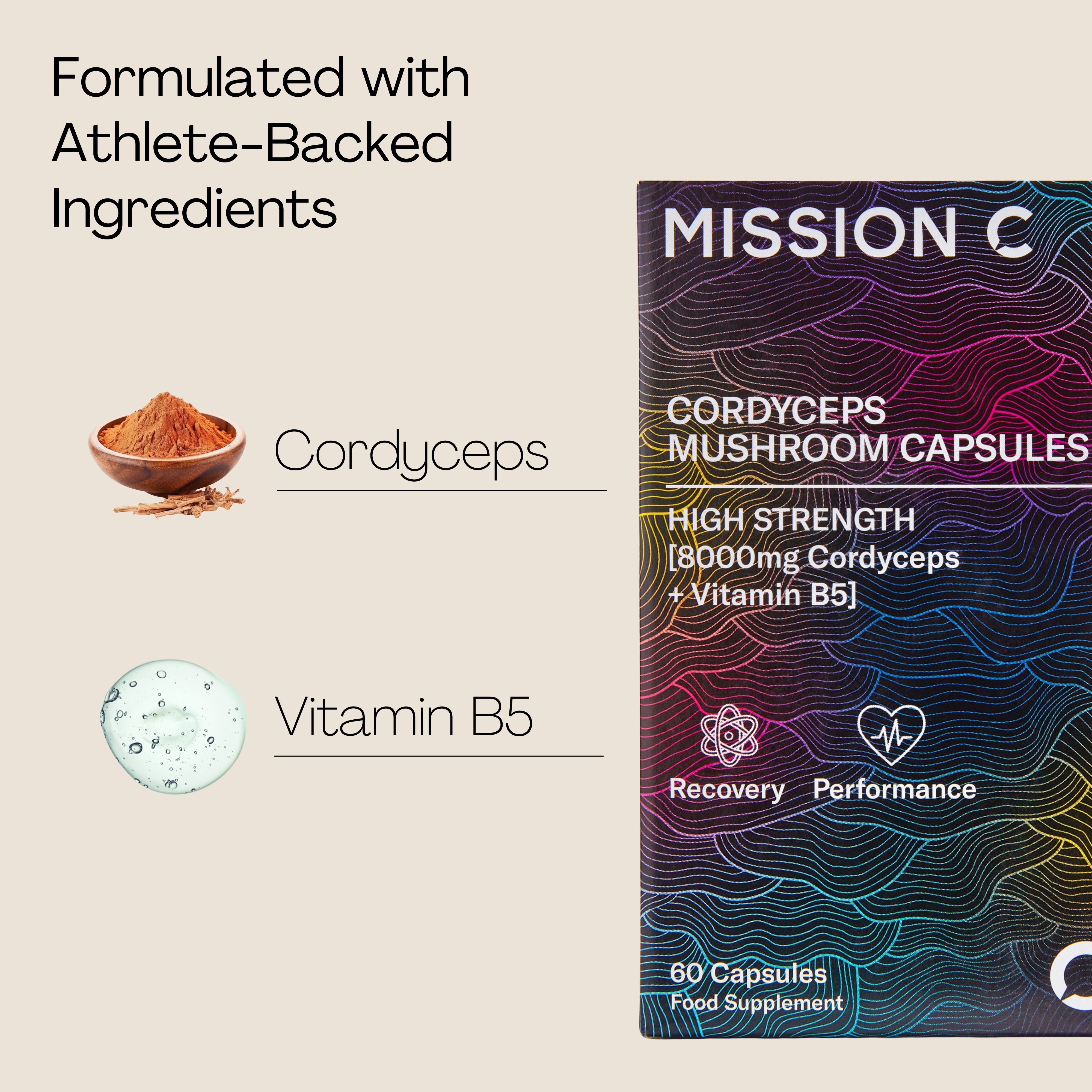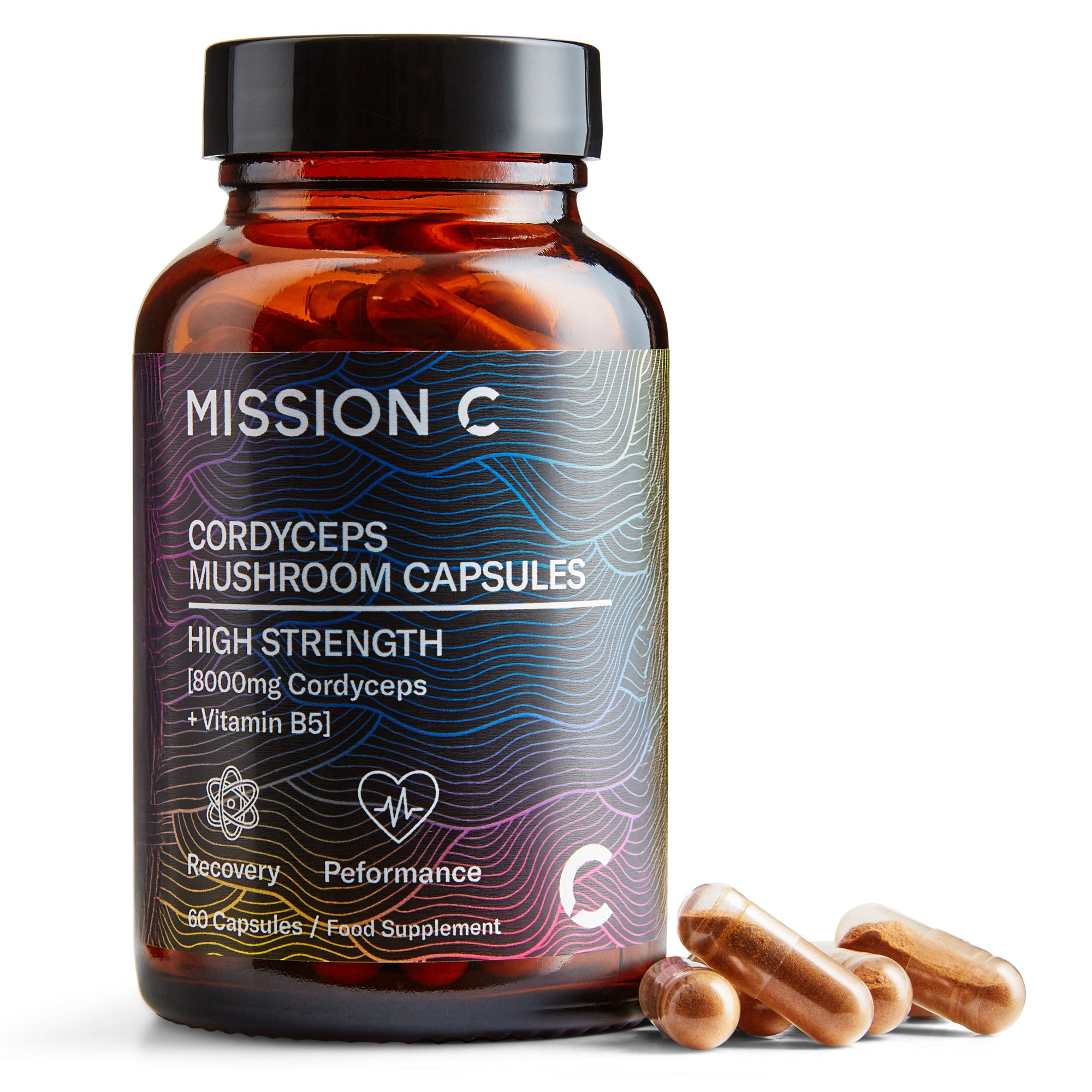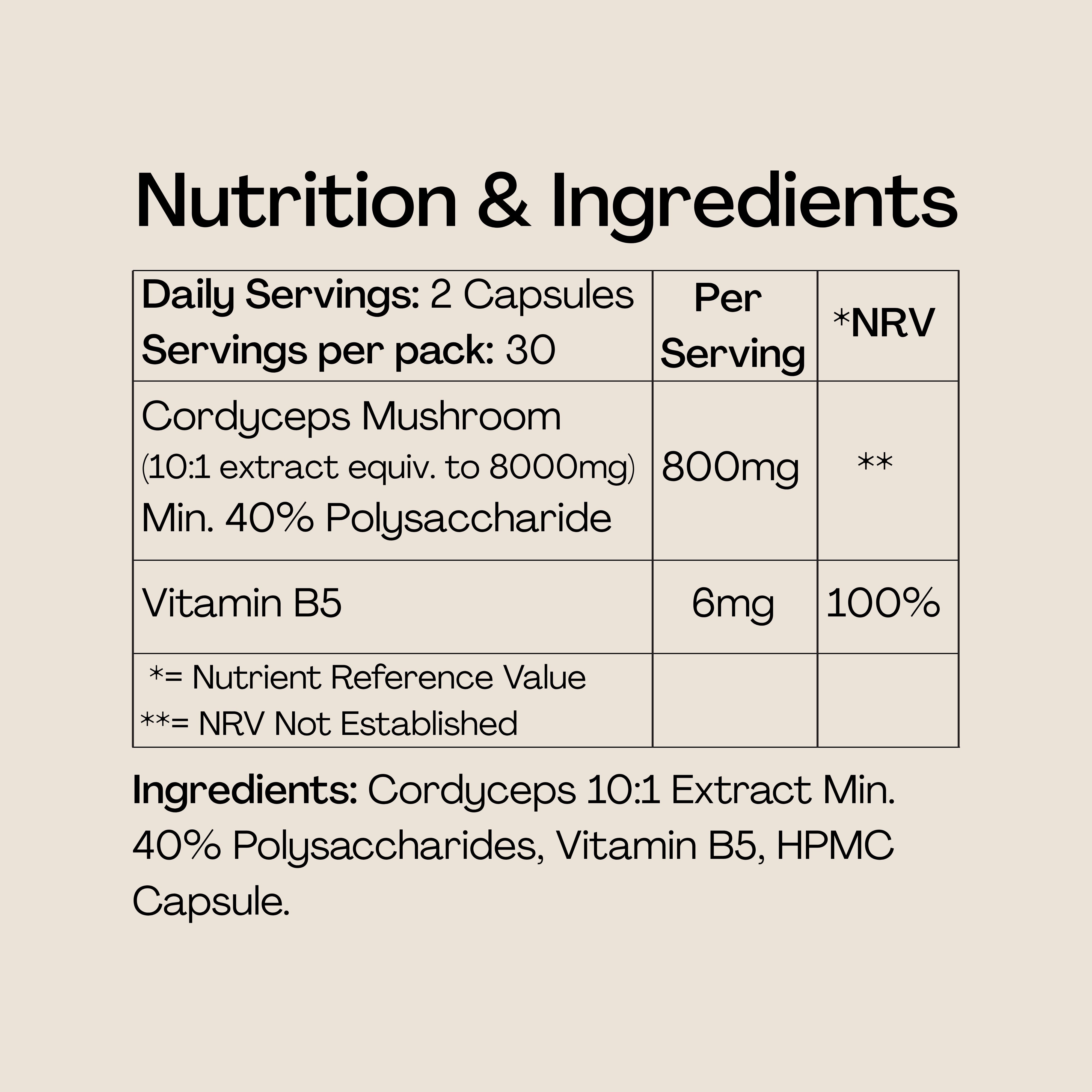 Cordyceps 10:1 Extract Min. 40% Polysaccharides, Vitamin B5, HPMC Capsule.