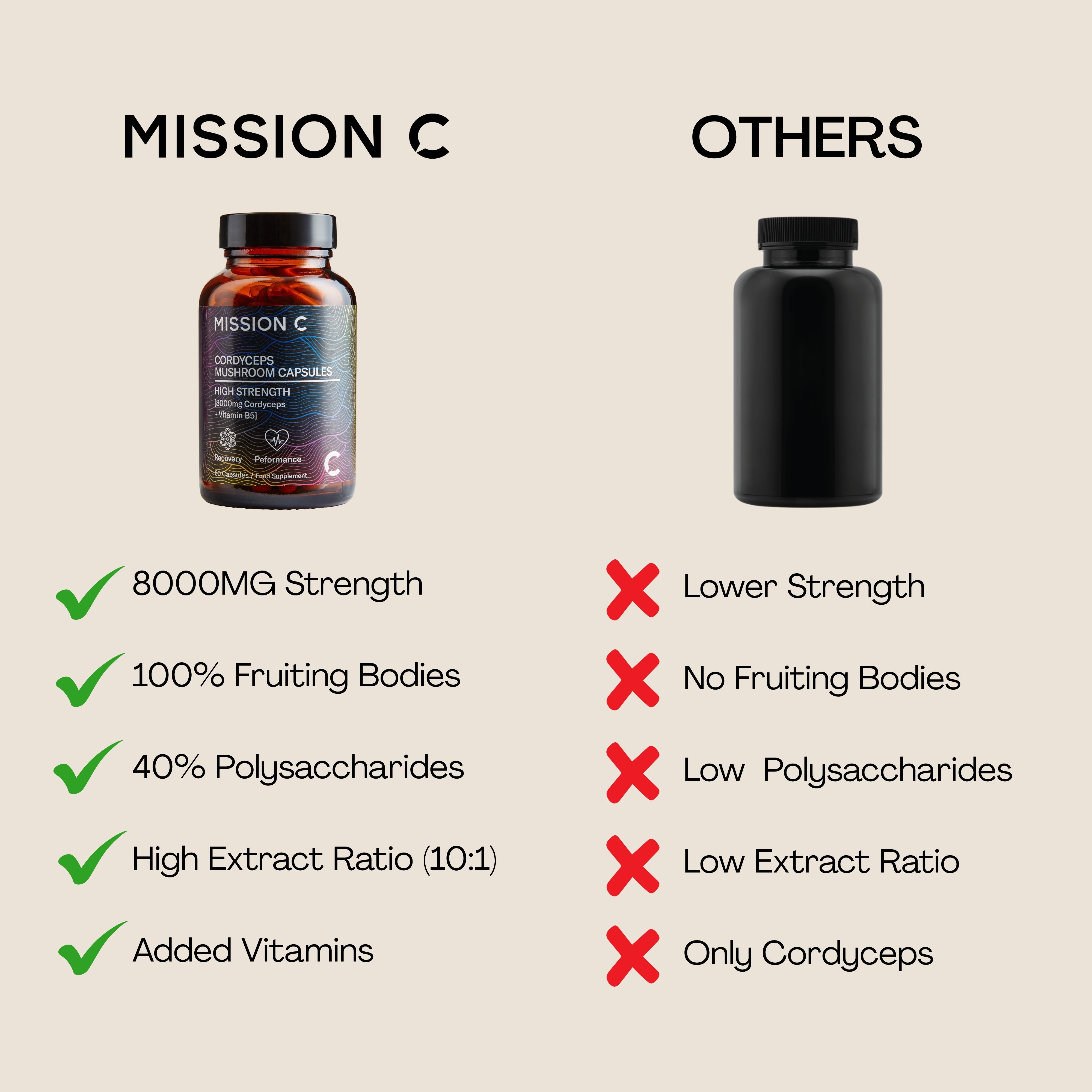 Quality without compromise is always front and centre. This is why our Cordyceps is a higher strength for less than everyone else. With 40% polysacchardies, combined with vitamins B5 to create an even more effective mushroom, packed into convenient and all natural plant based capsule.